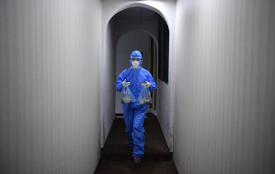 A staff member delivers hot dry noodles, or reganmian, a snack famous in both Wuhan of Hubei Province and Xinyang of Henan Province to people being treated in isolation for medical observation at a hotel in Xinyang, central China's Henan Province, Feb. 5, 2020. (Xinhua/Li Jianan)