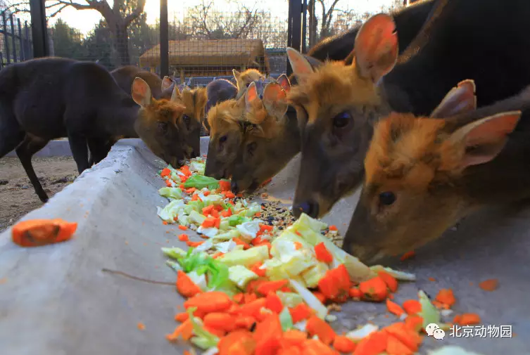 Black muntjacs eat food at the Beijing Zoo. (Provided to Xinhua)