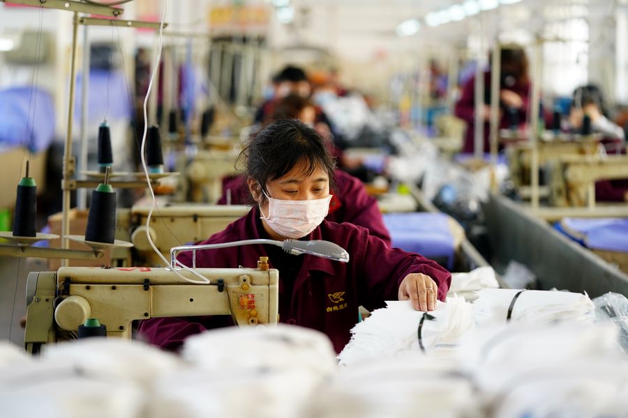 Workers make face masks at the workshop of a face mask company in Taiyuan, capital of north China's Shanxi Province, Feb. 13, 2020. Face mask companies in Taiyuan have stepped up production at full speed to increase market supply amid the fight against novel coronavirus. (Xinhua/Zhan Yan)