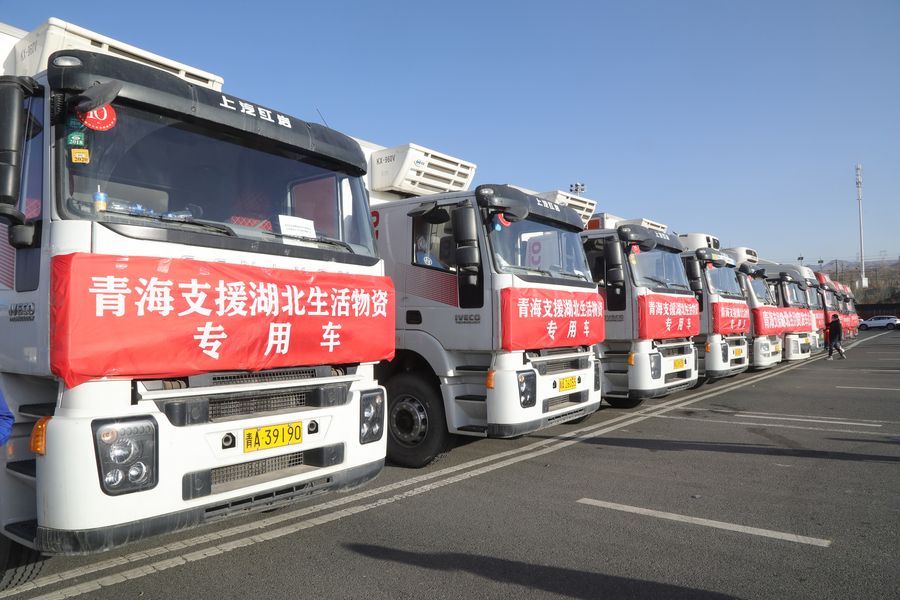 Trucks loaded with food and medical materials are seen before leaving for Hubei Province at Haidong toll station on the Qinghai-Tibet Expressway, northwest China's Qinghai Province, Feb. 13, 2020. (Xinhua/Zhao Yuhe)