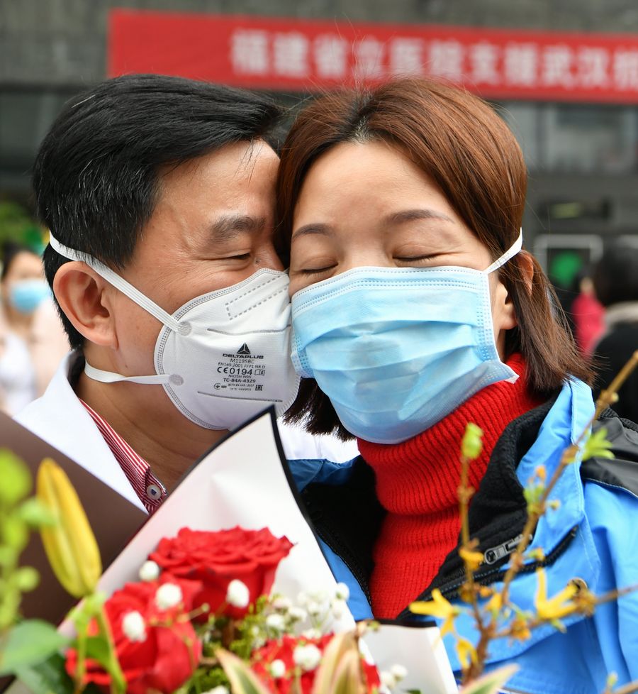 Medical team member Xu Bifang (R) bids goodbye to her husband before leaving for Wuhan of central China's Hubei Province at the Fujian Provincial Hospital in Fuzhou, southeast China's Fujian Province, Feb. 13, 2020. A team comprised of 277 medical workers from Fujian left for Wuhan on Thursday to aid the novel coronavirus control efforts there. (Xinhua/Wei Peiquan)