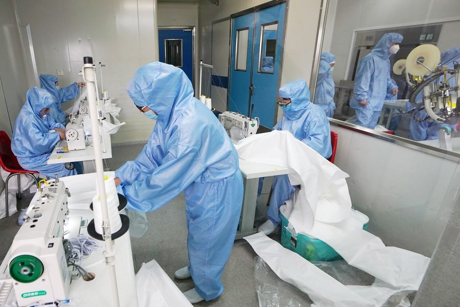 Workers make medical protective materials in a workshop of the general pharmaceutical factory of Harbin Pharmaceutical Group Co., Ltd. in Harbin, northeast China's Heilongjiang Province, Feb. 9, 2020. A number of enterprises in Heilongjiang Province have resumed production to ensure the supply of protective materials and other products on the market during the fight against the novel coronavirus epidemic. (Xinhua/Wang Jianwei)