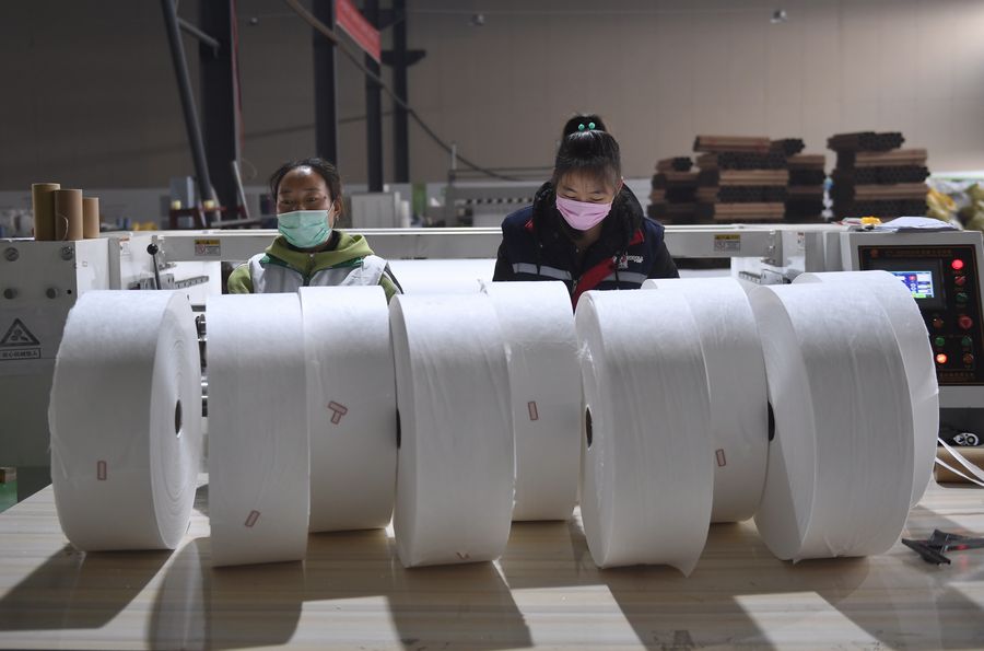 Technicians arrange melt-blown nonwovens at a workshop of a new material company in Chengdu, southwest China's Sichuan Province, Feb. 12, 2020. The demand for face masks has witnessed a large increase since the outbreak of the novel coronavirus infection (COVID-19). The company in Chengdu has been producing 2.2 tons of melt-blown nonwovens per day to meet the demand of face mask production. (Xinhua/Liu Kun)■