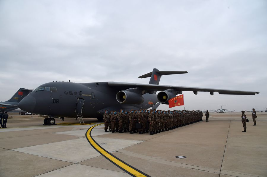 Military medics airlifted by the transport aircraft Y-20 of the People's Liberation Army (PLA) Air Force arrive at Tianhe International Airport in Wuhan, central China's Hubei Province, Feb. 13, 2020. Ordered by the Central Military Commission, 11 transport aircraft of the PLA Air Force Thursday sent medics and supplies provided by the armed forces to virus-hit Wuhan. (Xinhua/Li Yun)