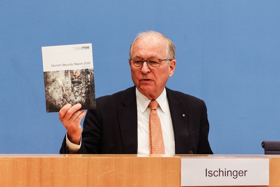 Chairman of the Munich Security Conference (MSC) Wolfgang Ischinger holds a copy of Munich Security Report during a press conference in Berlin, Germany, on Feb. 10, 2020. (Xinhua/Ren Ke)