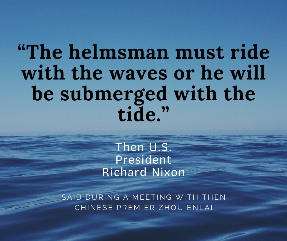"The helmsman must ride with the waves, or he will be submerged with the tide," Nixon said during a meeting with then Chinese Premier Zhou Enlai.