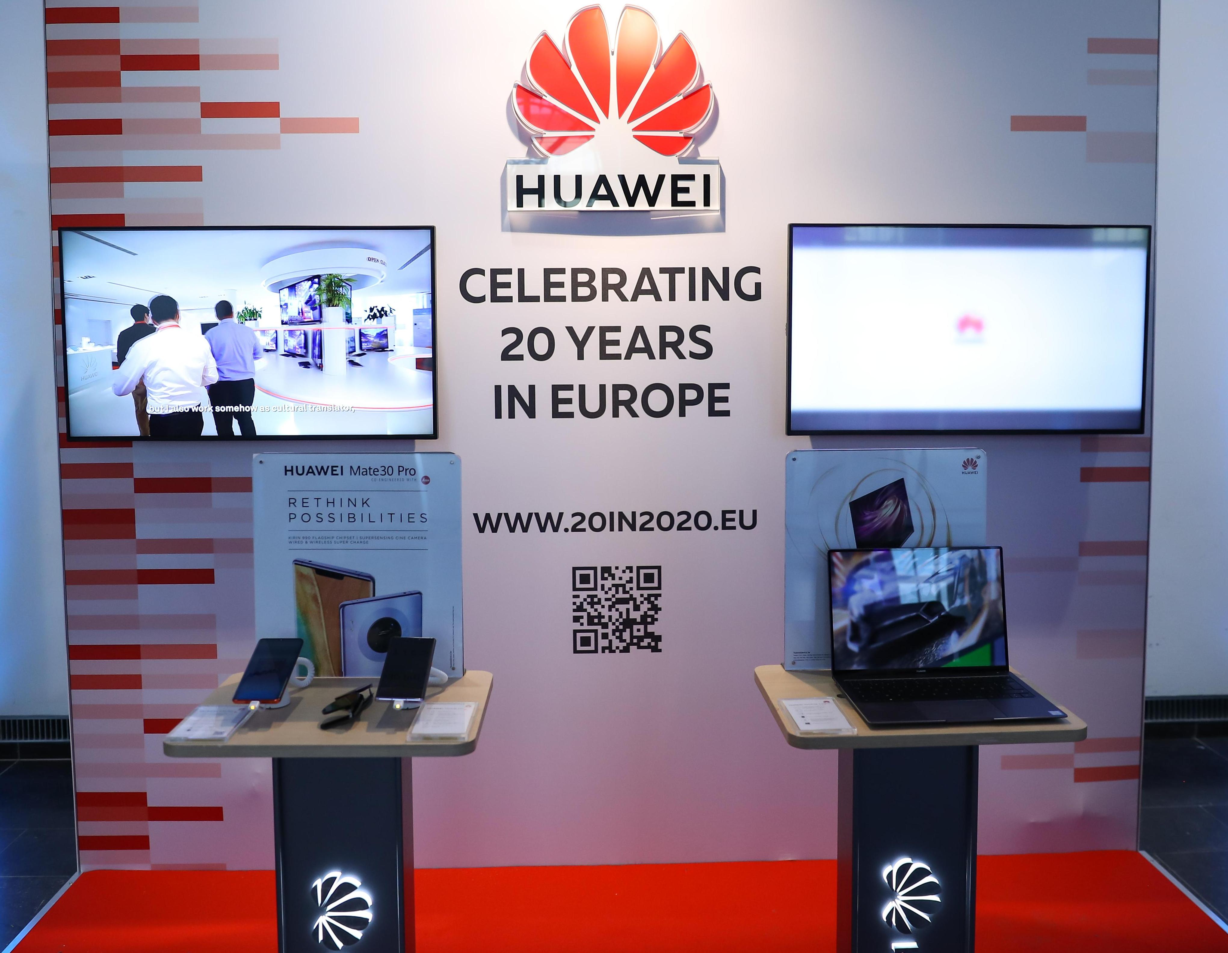 Photo taken on Feb. 6, 2020 shows Huawei products exhibited at "Masters of Digital", an anual event for experts to discuss the future of a stronger digital Europe, in Brussels, Belgium. (Xinhua/Zhang Cheng)