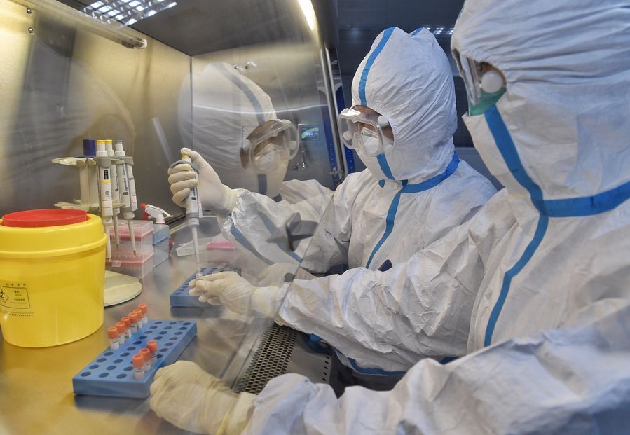 Staff members work at the health and quarantine comprehensive laboratory of Sichuan International Travel Health Care Center (Chengdu Customs Port Outpatient Department), in Chengdu, southwest China's Sichuan, Feb. 15, 2020. (Xinhua/Liu Kun)