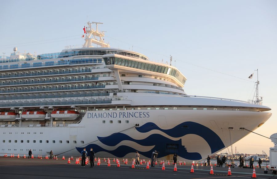 Photo taken on Feb. 6, 2020 shows the "Diamond Princess", a cruise ship which has been kept in quarantine at the port of Yokohama in Japan. (Xinhua/Du Xiaoyi)