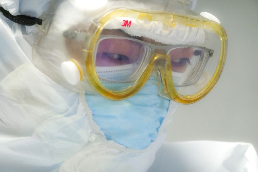 A medical worker from the Affiliated Hospital of Qingdao University checks the face mask and eye protector at Guanggu area of Wuhan-based Tongji Hospital in Wuhan, central China's Hubei Province, Feb. 20, 2020. To better protect medical workers, some targeted and precise prevention measures are strictly taken during work time and off-work time by medical staff of the Affiliated Hospital of Qingdao University who are in Hubei to aid the fight against the virus. (Xinhua/Cai Yang)
