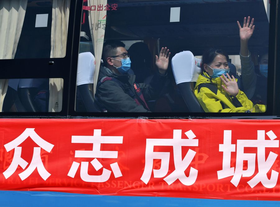 Medical staff wave goodbye on a bus bound for the airport where they will leave for Wuhan of central China's Hubei Province, in Fuzhou, southeast China's Fujian Province, Feb. 20, 2020. The 11th batch of 172 medical staff of Fujian Province departed on Thursday for Wuhan to aid the novel coronavirus control efforts there. (Xinhua/Wei Peiquan)