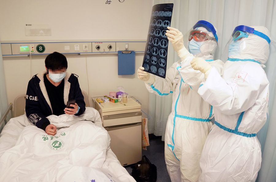 Zhao Jianping (2nd R), a respiratory and critical care specialist from the Wuhan-based Tongji Hospital, examines the CT result of a patient at the severe case ward in Wuhan, central China's Hubei Province, Feb. 18, 2020. (Xinhua/Wang Yuguo)