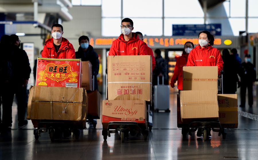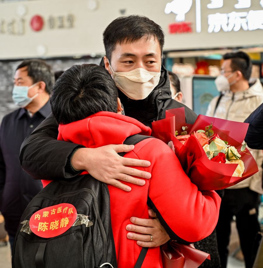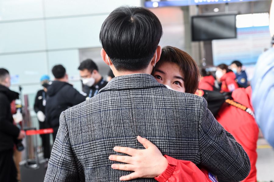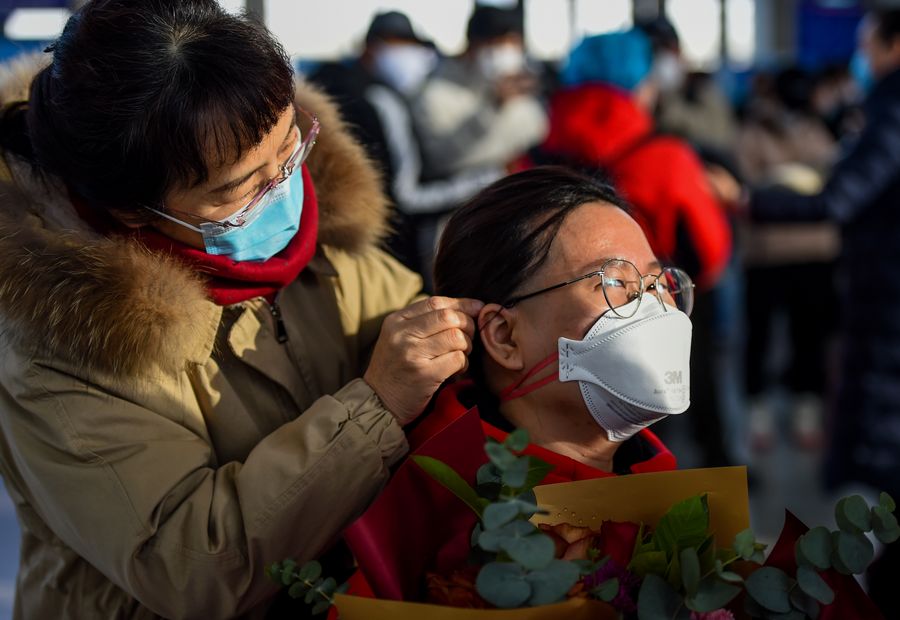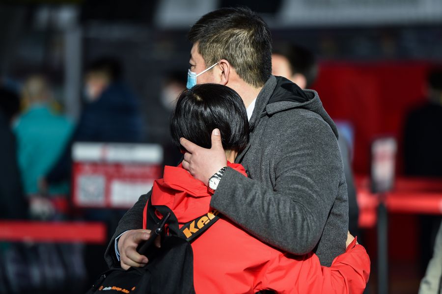 A family member (R) sees off a medical worker leaving for Hubei Province at Hohhot Baita International Airport in Hohhot, capital of north China's Inner Mongolia Autonomous Region, Feb. 21, 2020. (Xinhua/Lian Zhen)