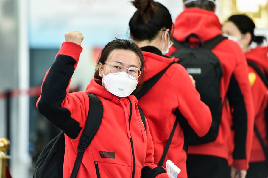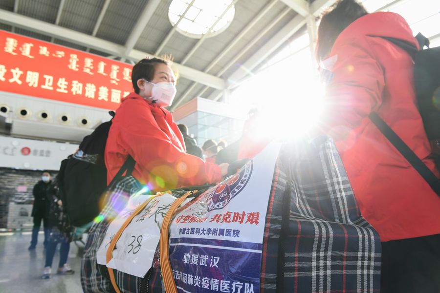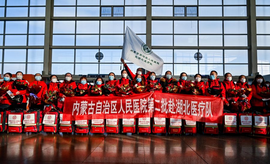 Medical team members are seen before leaving for Hubei Province at Hohhot Baita International Airport in Hohhot, capital of north China's Inner Mongolia Autonomous Region, Feb. 21, 2020. (Xinhua/Liu Lei)