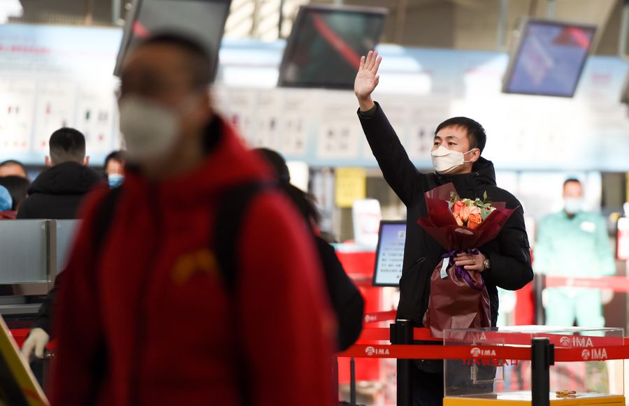 A medical worker (R) waves goodbye to her family before leaving for Hubei Province at Hohhot Baita International Airport in Hohhot, capital of north China's Inner Mongolia Autonomous Region, Feb. 21, 2020. (Xinhua/Liu Lei)