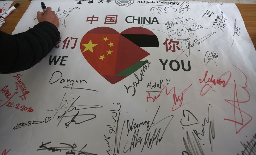 A Palestinian university student writes his name on a banner in solidarity with China, at the Al-Quds University in the West Bank city of Ramallah, Feb. 22, 2020. (Xinhua/Ayman Nobani)