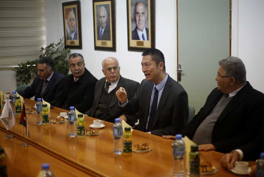 Guo Wei, (2 from R) director of the Office of the People's Republic of China to the State of Palestine, speaks to Palestinian academics at the Al-Quds University in the West Bank city of Ramallah, Feb. 22, 2020. (Xinhua/Ayman Nobani)