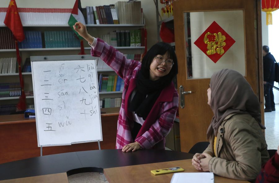 A Chinese teacher speaks with Palestinian students inside the Confucius Institute at the Al-Quds University in the West Bank city of Ramallah, Feb. 22, 2020. (Xinhua/Ayman Nobani/Xinhua)