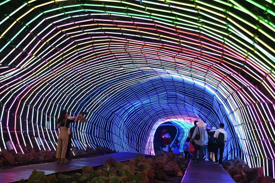 Visitors walk through a tunnel transformed from an abandoned mine at the Cinnabar tourism town in Wanshan District of Tongren, southwest China's Guizhou Province, Oct. 5, 2019. (Xinhua/Yang Wenbin)