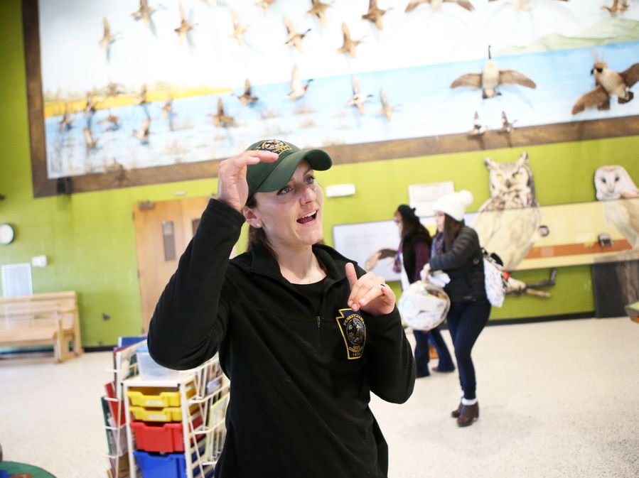 Lauren Ferreri, visitor and biological manager at Middle Creek, is interviewed by Xinhua at the Visitors Center of the Middle Creek Wildlife Management Area in Lancaster County, Pennsylvania, the United States, on Feb. 22, 2020. (Xinhua/Qin Lang)