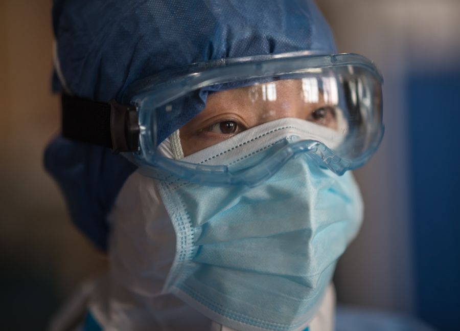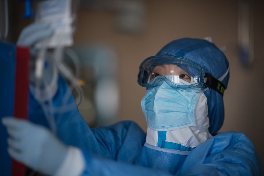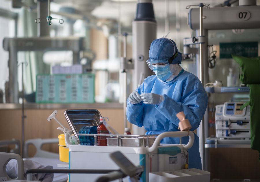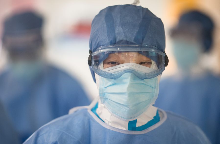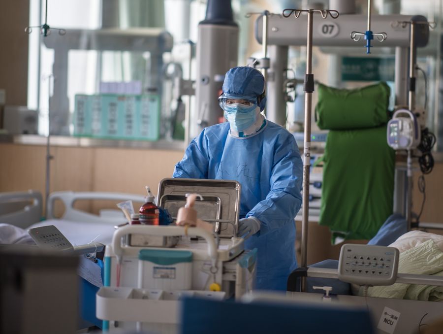 Head nurse Sun Chun works at an ICU ward of the First Hospital of Wuhan City in Wuhan, central China's Hubei Province, Feb. 22, 2020. (Xinhua/Xiao Yijiu)