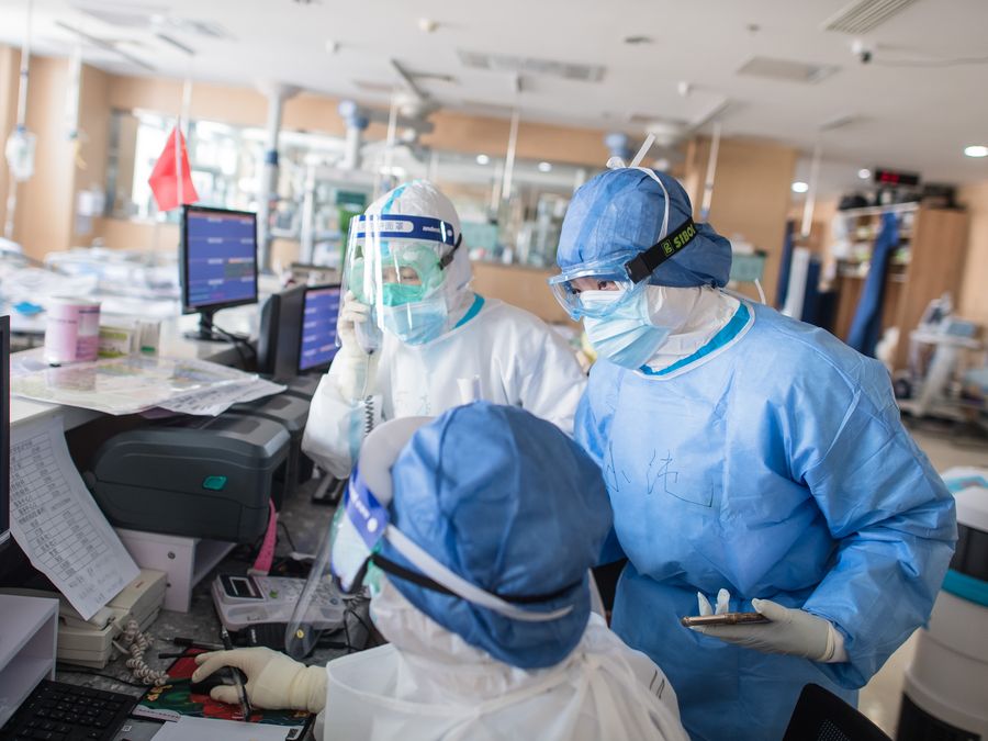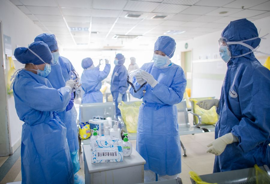 Head nurse Sun Chun works with colleagues at an ICU ward of the First Hospital of Wuhan City in Wuhan, central China's Hubei Province, Feb. 22, 2020. (Xinhua/Xiao Yijiu)