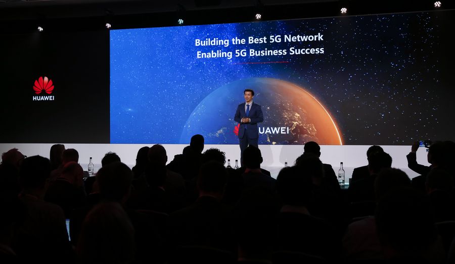 Peng Song, President of Huawei's Carrier BG (business group) Marketing and Solution Sales Dept., speaks at Huawei product and solution launch event in London, Britain, on Feb. 20, 2020. (Xinhua/Han Yan)