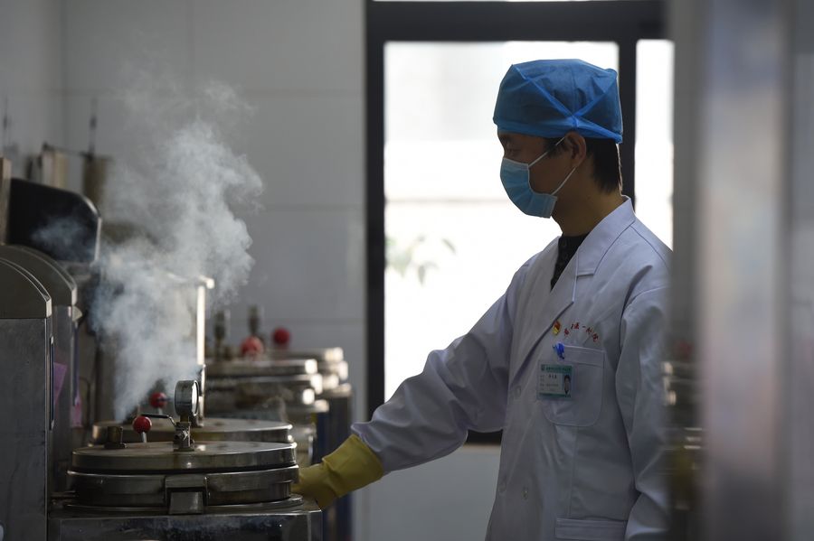 A pharmacist boils traditional Chinese medicine (TCM) at The First Affiliated Hospital of Anhui University of Chinese Medicine in Hefei, east China's Anhui Province, Feb. 24, 2020. The hospital took the responsibility for compounding, boiling and delivering traditional Chinese medicine to seven designated hospitals for treating COVID-19 patients in Hefei. (Xinhua/Zhou Mu)