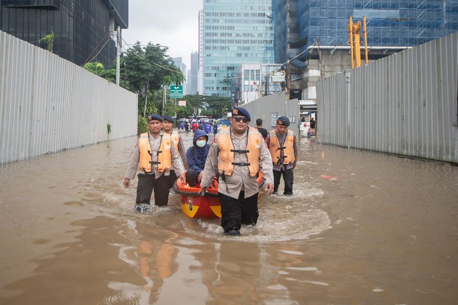Police evacuate people with a boat in flood in Jakarta, Indonesia, Feb. 25, 2020. (Xinhua/Veri Sanovri)