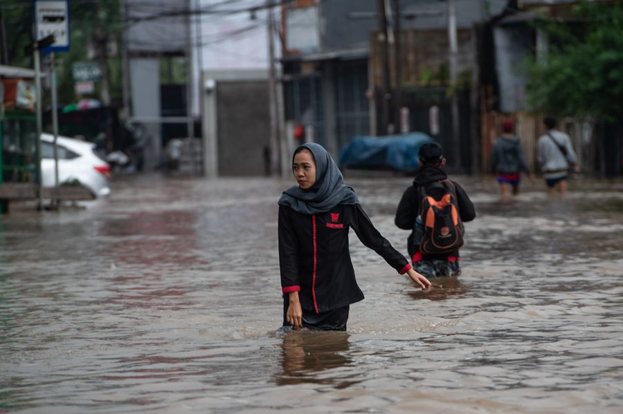 People walk in flood in Jakarta, Indonesia, Feb. 25, 2020. (Xinhua/Veri Sanovri)