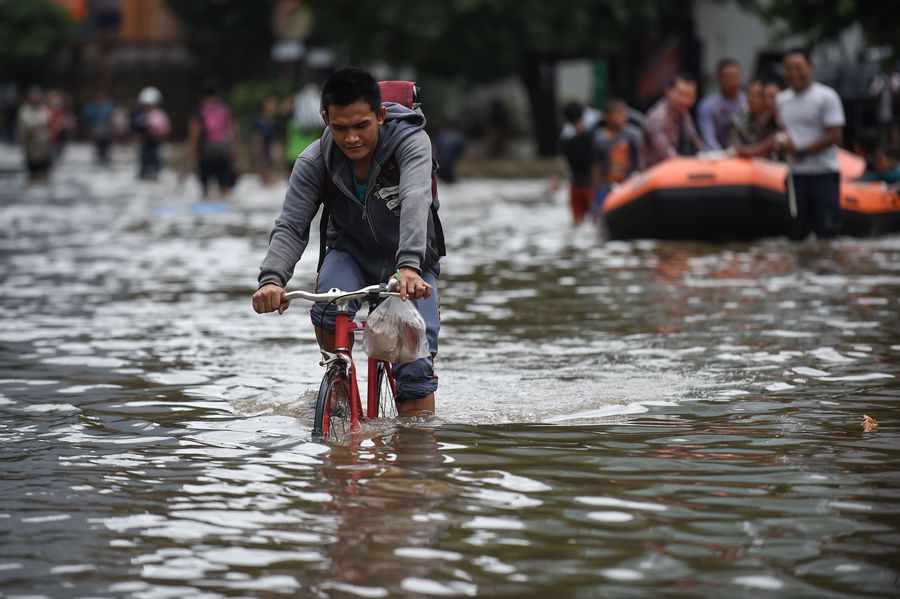A man rides a bike in flood in Jakarta, Indonesia. Feb. 25, 2020. (Xinhua/Agung Kuncahya B.)