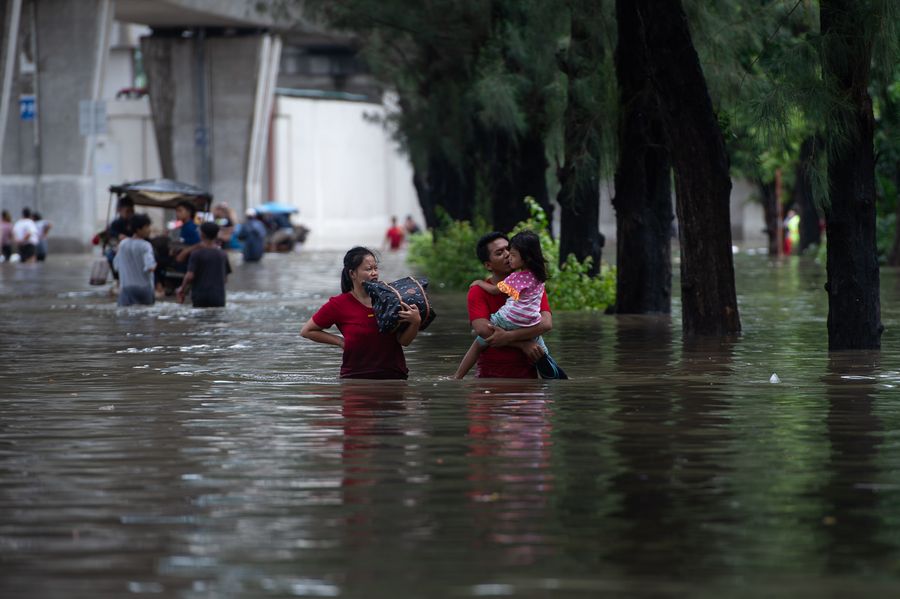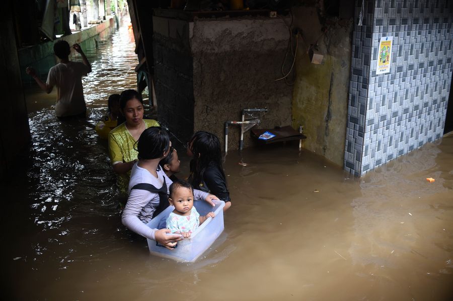 Indonesian people walk in flood after a heavy rain in Jakarta, Indonesia, Feb. 25, 2020. (Xinhua/Zulkarnain)