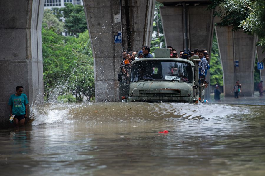 People are evacuated by taking a military truck during the flood in Jakarta, Indonesia, Feb. 25, 2020. (Xinhua/Veri Sanovri)