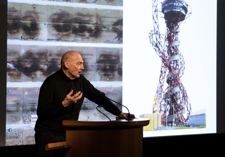 Dutch architect Rem Koolhaas delivers a remark during the preview of the "Countryside, The Future" exhibition at Solomon R. Guggenheim Museum in New York, the United States, Feb. 19, 2020. (Xinhua/Wang Ying)