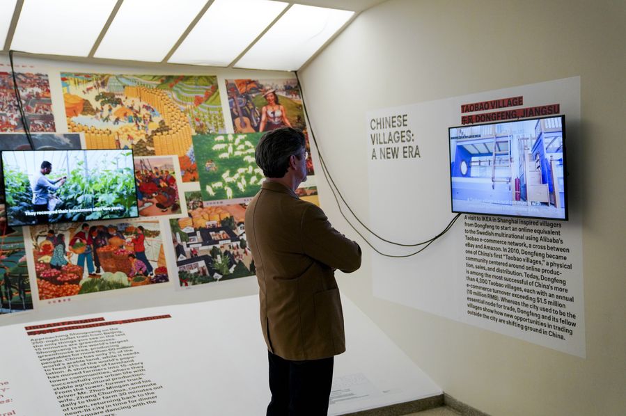 A visitor attends the media preview of the exhibition "Countryside, the future" at Guggenheim Museum in New York, the United States, on Feb. 19, 2020. (Xinhua/Wang Ying)
