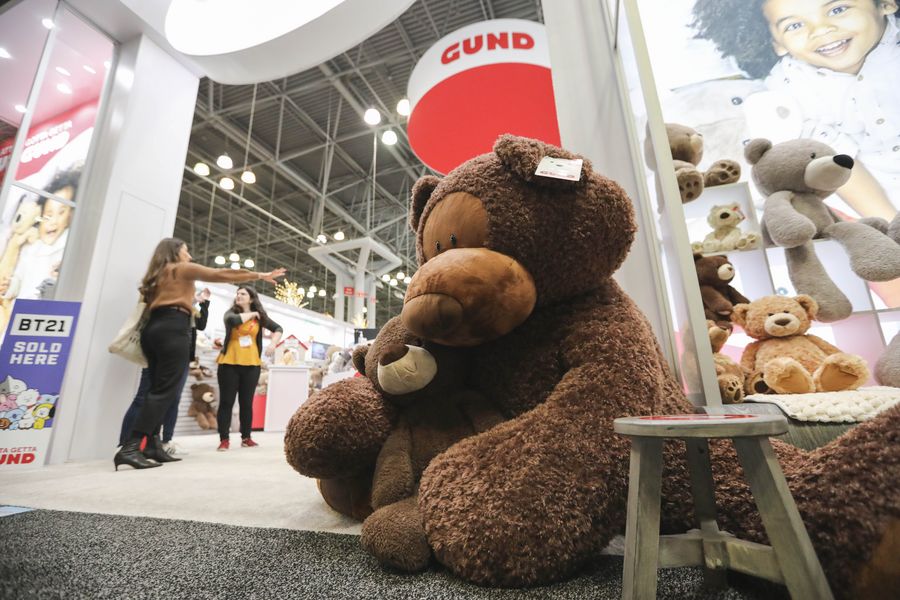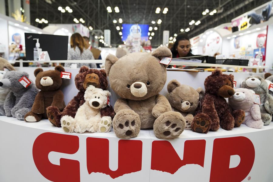Stuffed toys of Gund are on display at the company's booth at the 2020 Toy Fair New York in New York, the United States, Feb. 25, 2020. (Xinhua/Wang Ying)