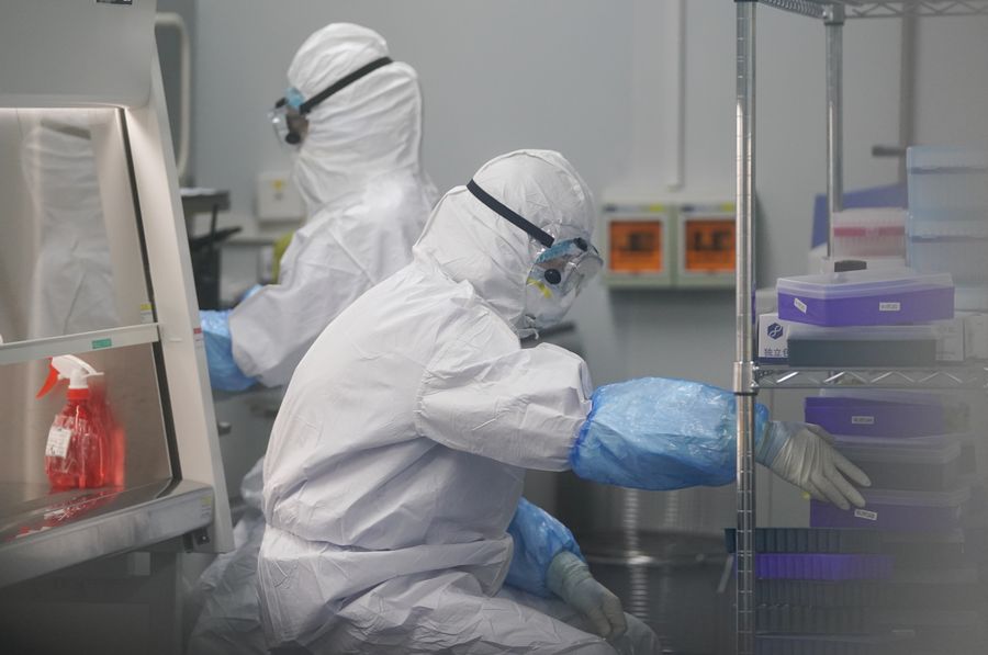 Staff members do nucleic acid testing work at a novel coronavirus detection lab in Wuhan, central China's Hubei Province, Feb. 22, 2020. (Xinhua/Cheng Min)