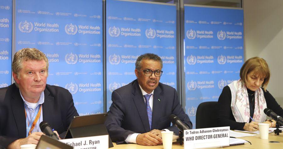 Dr. Tedros Adhanom Ghebreyesus (C), World Health Organization (WHO) Director-General, addresses a press conference, on which WHO said that China's latest epidemiological paper on COVID-19 is important in enabling it to provide advice to other countries, in Geneva, Switzerland, Feb. 17, 2020. (Xinhua/Chen Junxia)