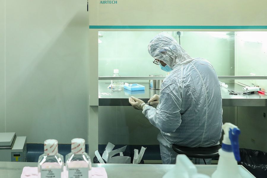 A researcher works in a laboratory in Beijing Health-Biotech Group in Beijing, capital of China, Feb. 14, 2020. (Xinhua/Zhang Yuwei)