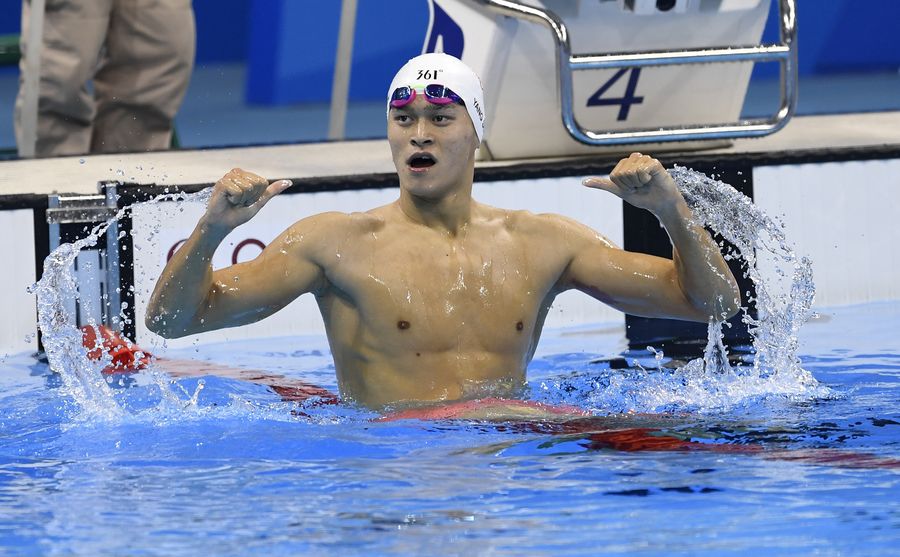 Sun Yang celebrates during the men's 200m freestyle swimming final at the 2016 Rio Olympic Games in Rio de Janeiro, Brazil, on Aug. 8, 2016. (Xinhua/Qi Heng)