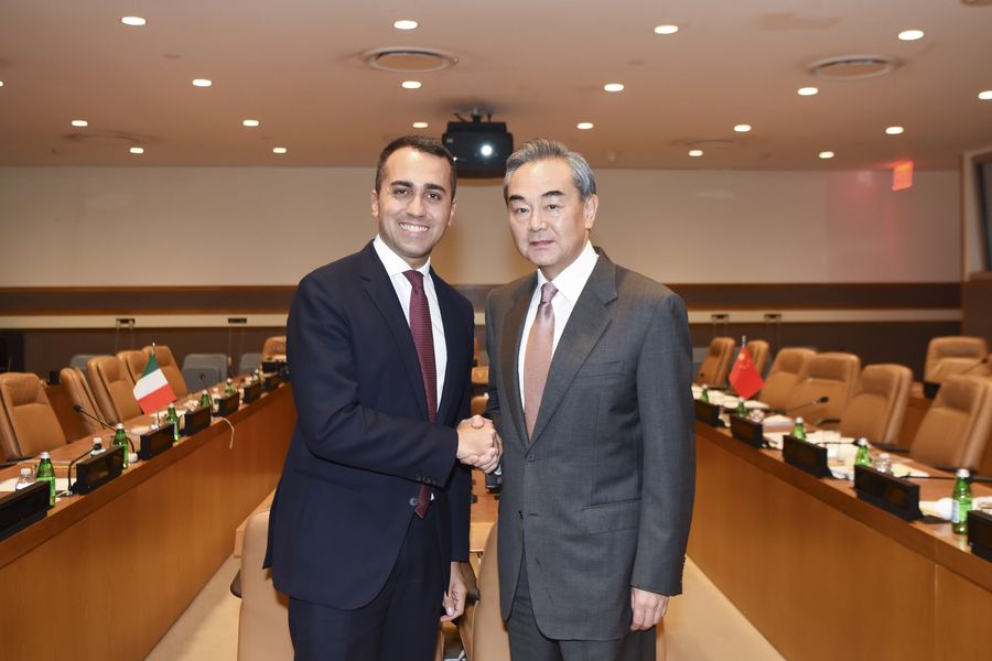 Chinese State Councilor and Foreign Minister Wang Yi (R) meets with Italian Foreign Minister Luigi Di Maio on the sidelines of the 74th session of the United Nations (UN) General Assembly at the UN headquarters in New York, Sept. 25, 2019. (Xinhua/Han Fang)
