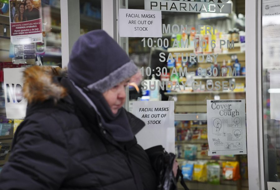 A notice showing "facial masks are out of stock" is seen on a door of a pharmacy in New York, the United States, Feb. 29, 2020. (Xinhua/Wang Ying)