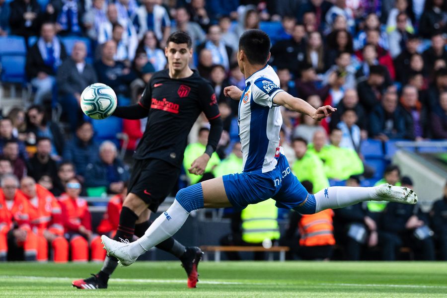 Espanyol's Wu Lei (R) shoots during a Spanish league match between RCD Espanyol and Athletico Madrid in Barcelona, Spain on March 1, 2020. (Photo by Joan Gosa/Xinhua)