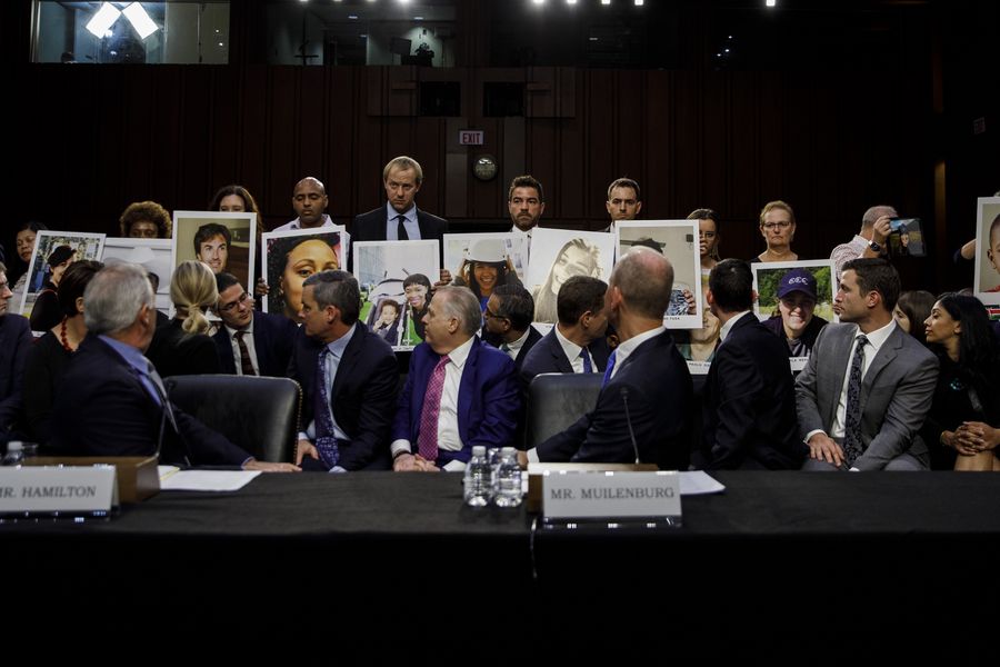 Boeing CEO Dennis Muilenburg (R Front) looks back at the family members of 737 Max crash victims as he attends a hearing before U.S. Senate Committee on Commerce, Science and Transportation on the Capitol Hill in Washington D.C., the United States, Oct. 29, 2019. (Photo by Ting Shen/Xinhua)