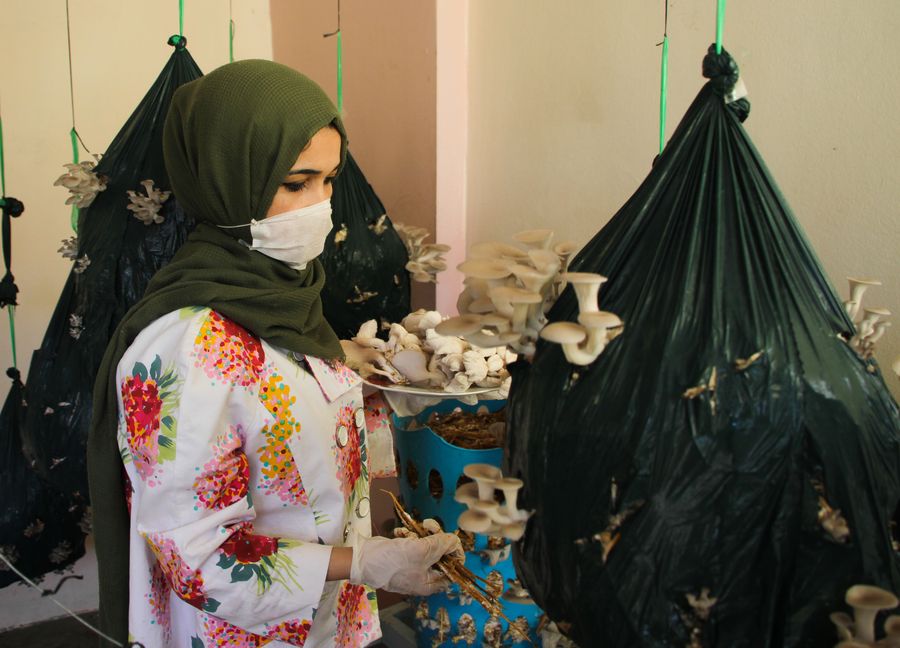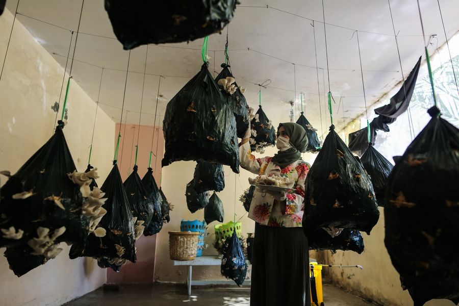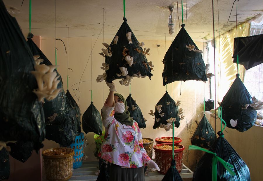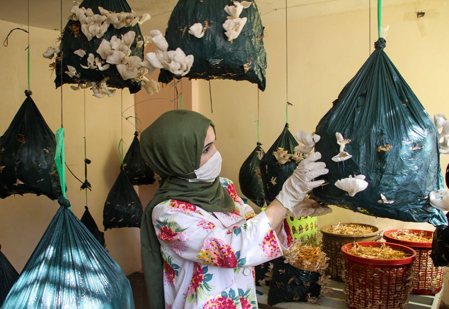 Alaa al-Masry checks oyster mushrooms at her house in Gaza City, on March 8, 2020. (Xinhua/Rizek Abdeljawad)