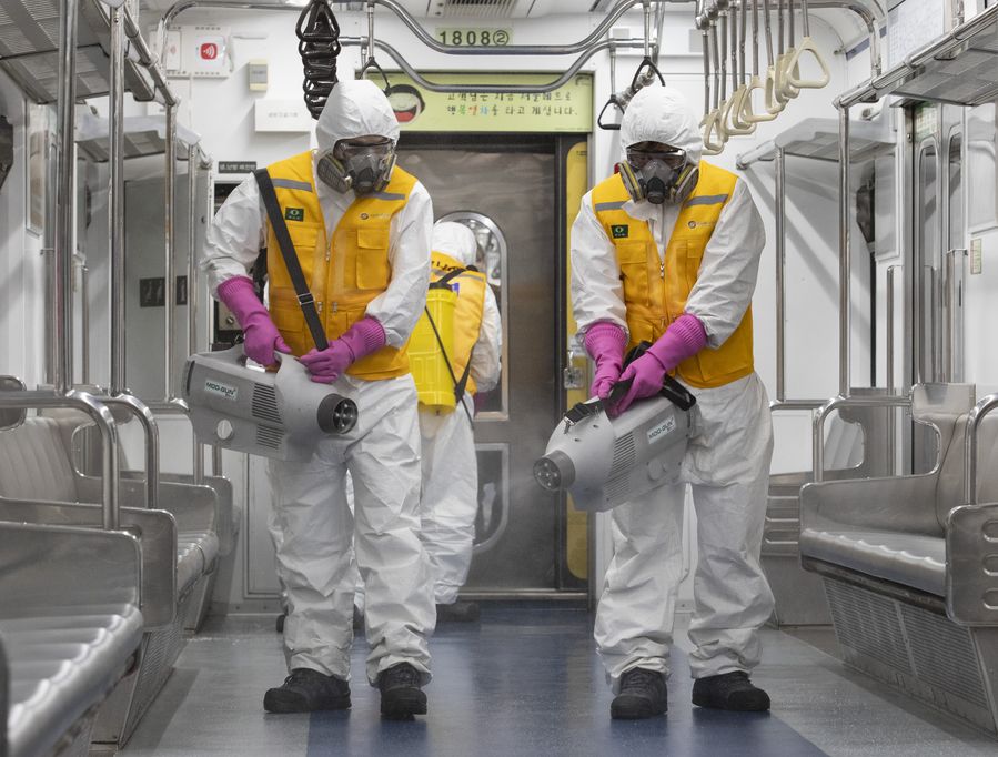 Staff members sterilize a metro train in Seoul, South Korea, March 11, 2020. (Photo by Lee Sang-ho/Xinhua)