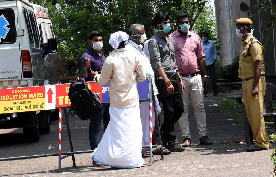 People are seen wearing masks outside the special isolation ward set up to provide treatment to novel coronavirus patients at Kochi Medical college, in Kerala, India, March 9, 2020. (Str/Xinhua)