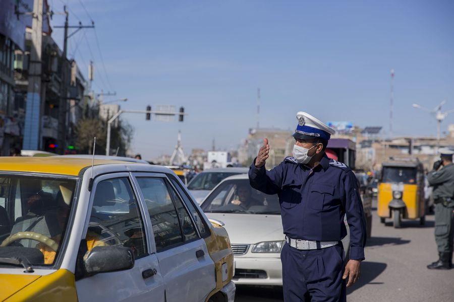 A policeman wearing mask guides vehicles in Herat province, western Afghanistan, where three new cases of COVID-19 were confirmed, on March 8, 2020. (Photo by Elaha Sahel/Xinhua)