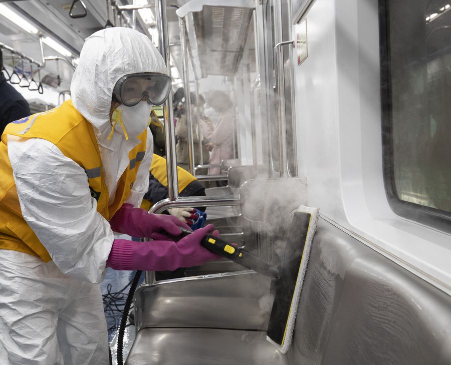 A staff member sterilizes a metro train in Seoul, South Korea, March 11, 2020. (Photo by Lee Sang-ho/Xinhua)