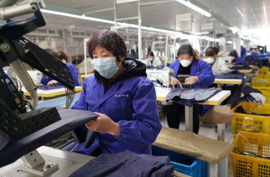 Workers are busy at the garment workshop of a foreign trade company in Neiqiu County of Xingtai City, north China's Hebei Province, March 4, 2020. (Xinhua/Zhu Xudong)